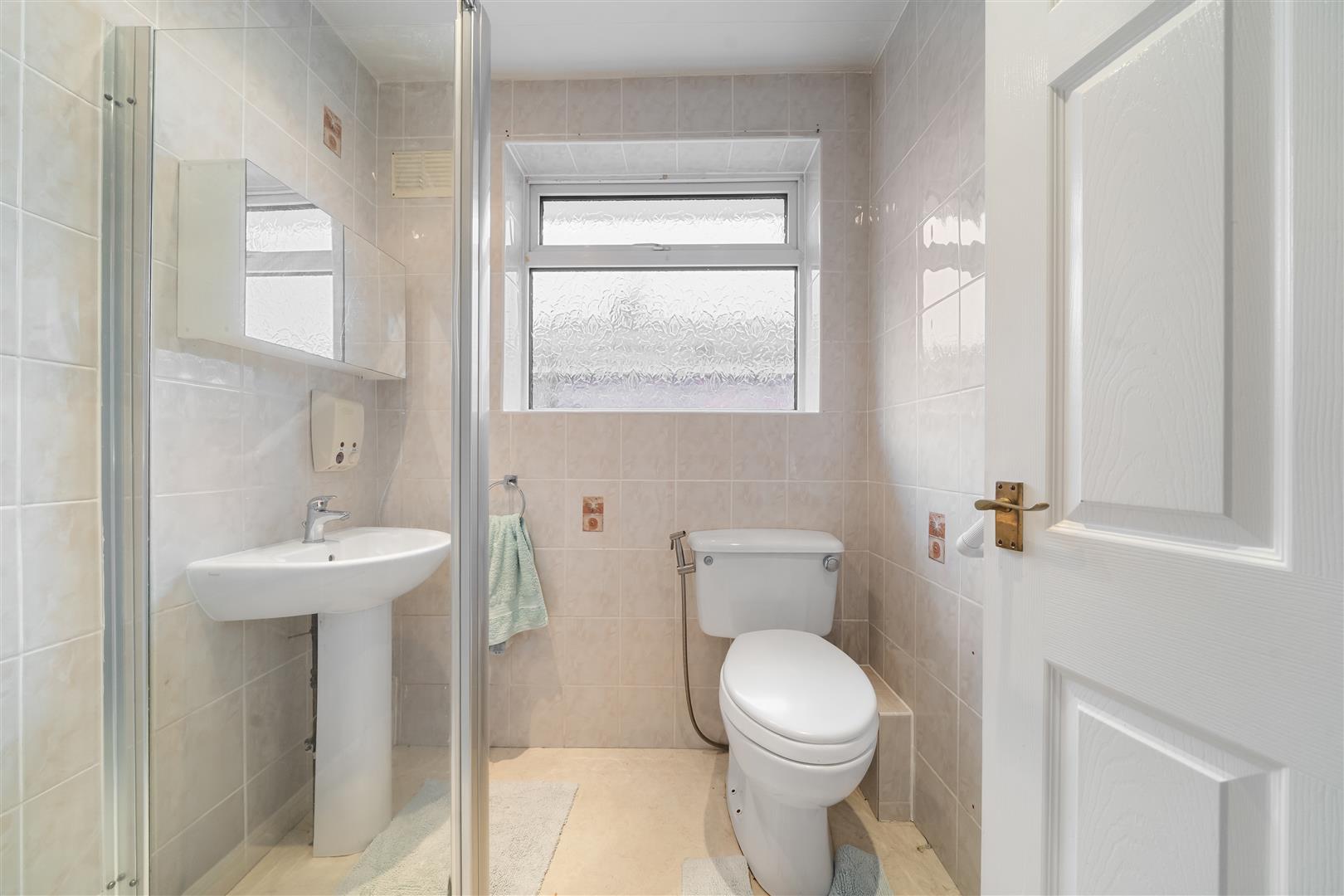 white suite comprising; shower cubicle with shower, wash hand basin and low level w.c., radiator, tiled walls, uPVC double glazed frosted window to side aspect