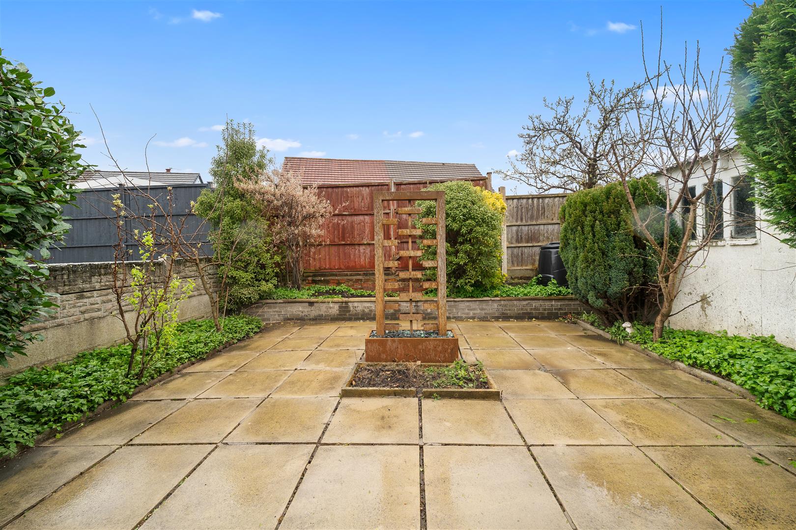 paved rear garden with ornamental borders
