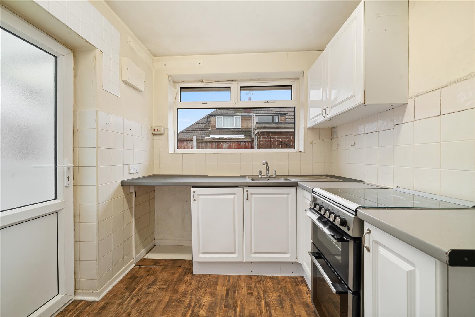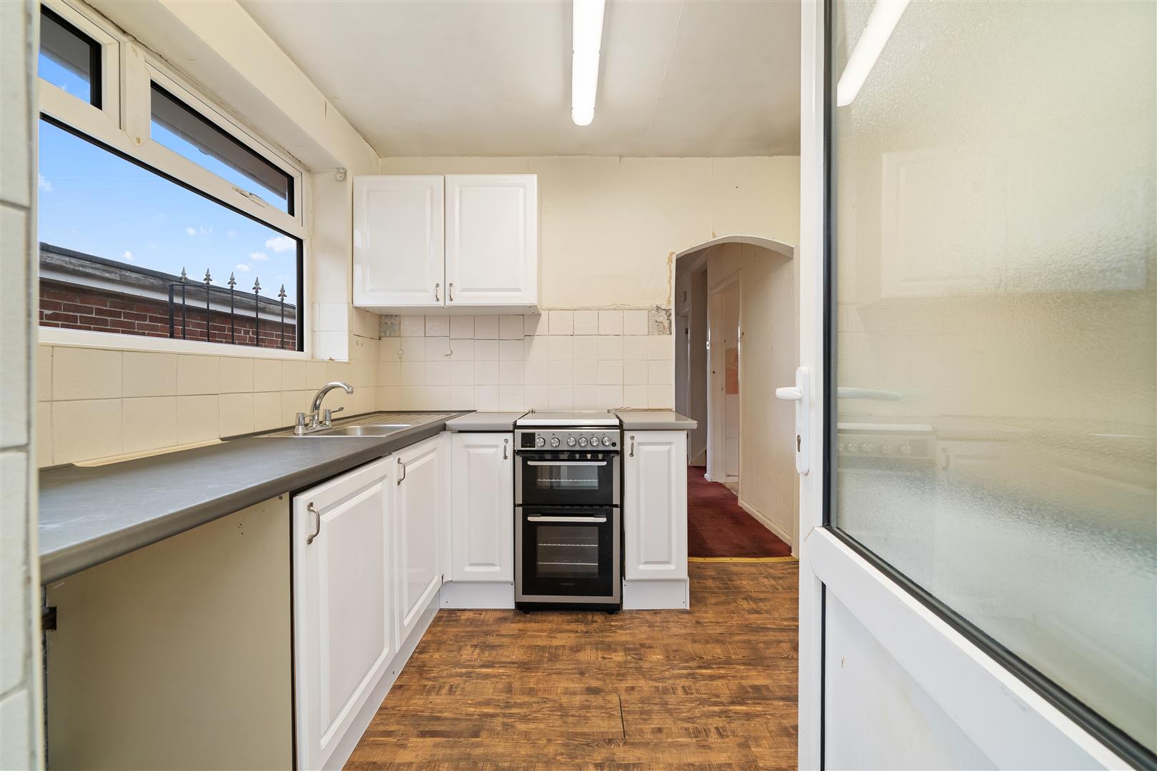 fitted kitchen with a range of base and wall cabinets with complementary worktops, cooker, plumbing for washing machine, part tiled walls, uPVC double glazed window to side aspect, uPVC door to conservatory