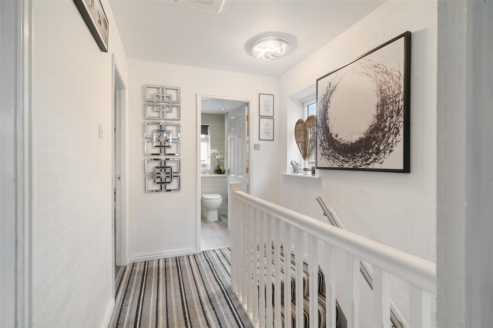 modern white suite comprising; wash hand basin and low level w.c., white heated towel radiator, tiled floor and part tiled walls, uPVC double glazed frosted windows to front and side aspects