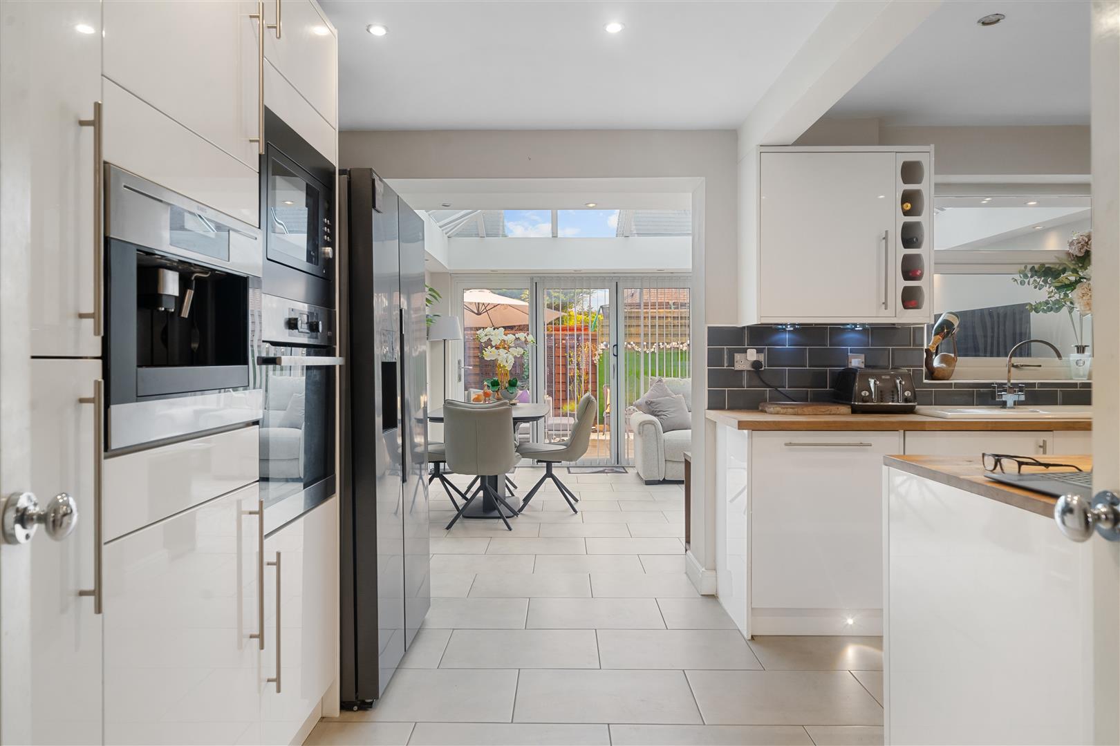 fabulous fitted kitchen with a range of base and wall cabinets with complementary worktops and breakfast bar, good range of integrated appliances (two separate ovens and gas hob with extractor over, microwave, coffee machine, dishwasher), space for american style fridge freezer, radiator, tiled floor and splashbacks, inset ceiling spotlights, pantry cupboard, uPVC door to side aspect, uPVC double glazed window to rear aspect, open to orangery