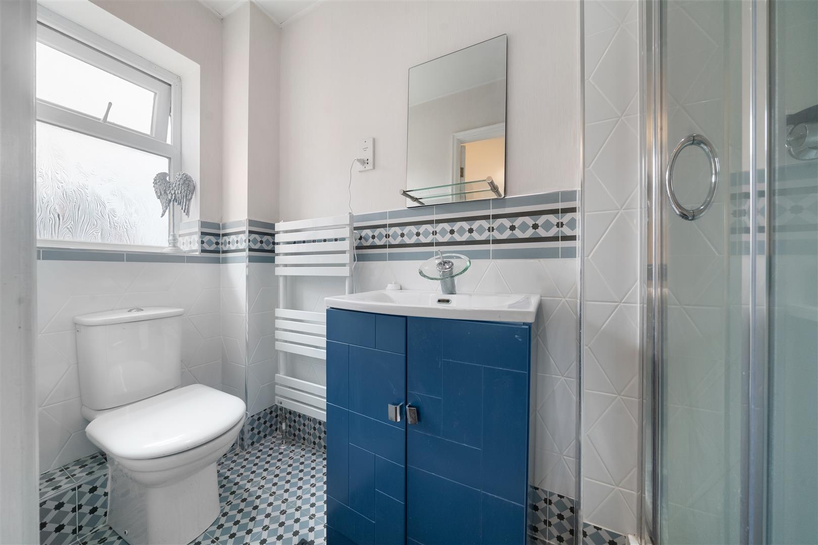modern white suite comprising; shower cubicle with mains shower, wash hand basin in vanity cabinet and low level w.c., white heated towel radiator, tiled floor and part tiled walls, uPVC double glazed frosted window to side aspect