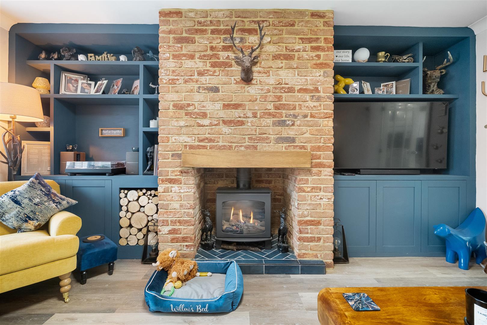 uPVC double glazed bay window to front aspect with plantation shutters, media wall and feature chimney breast with glass fronted log burner effect gas fire, traditional style column radiator, luxury vinyl flooring, double doors to kitchen