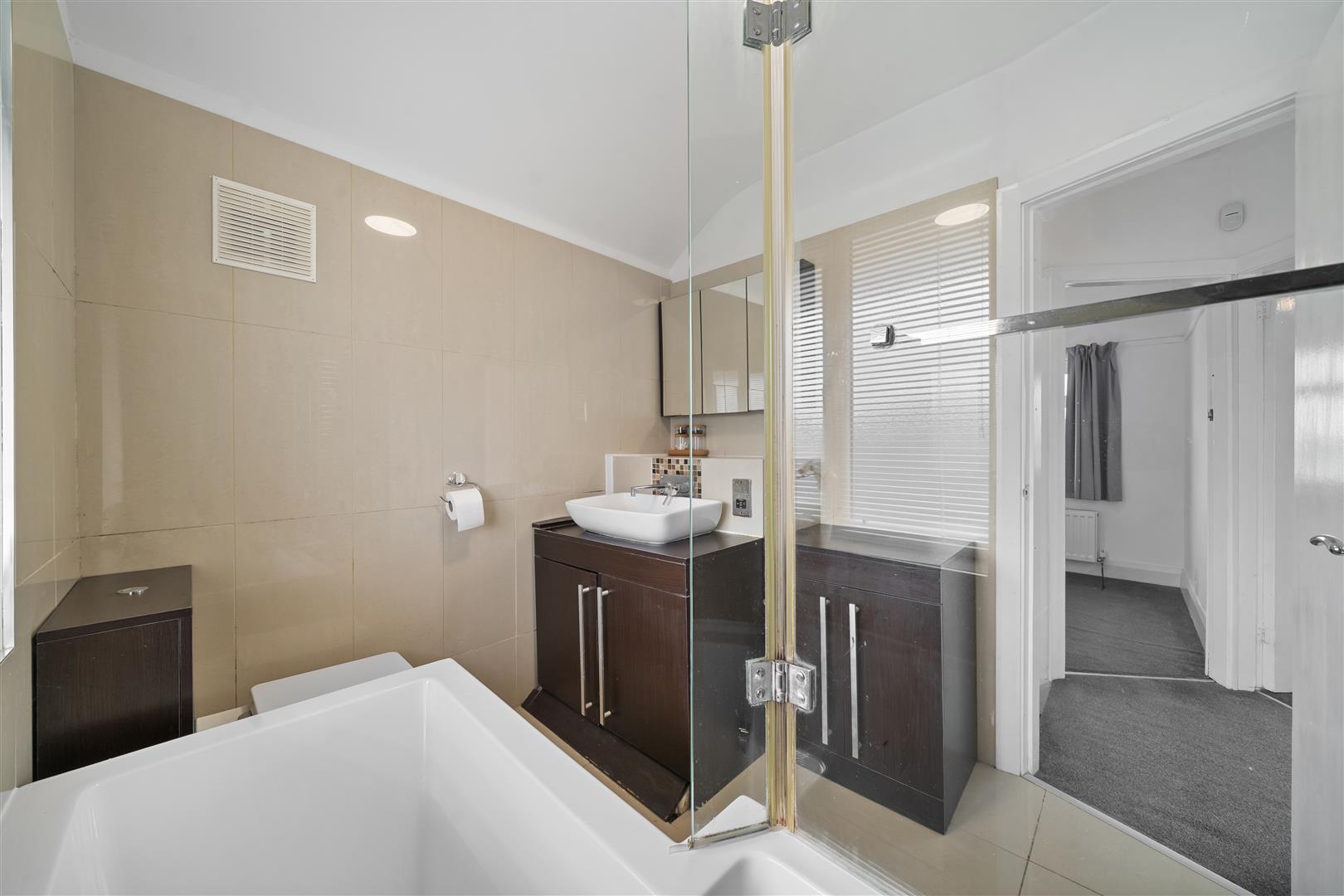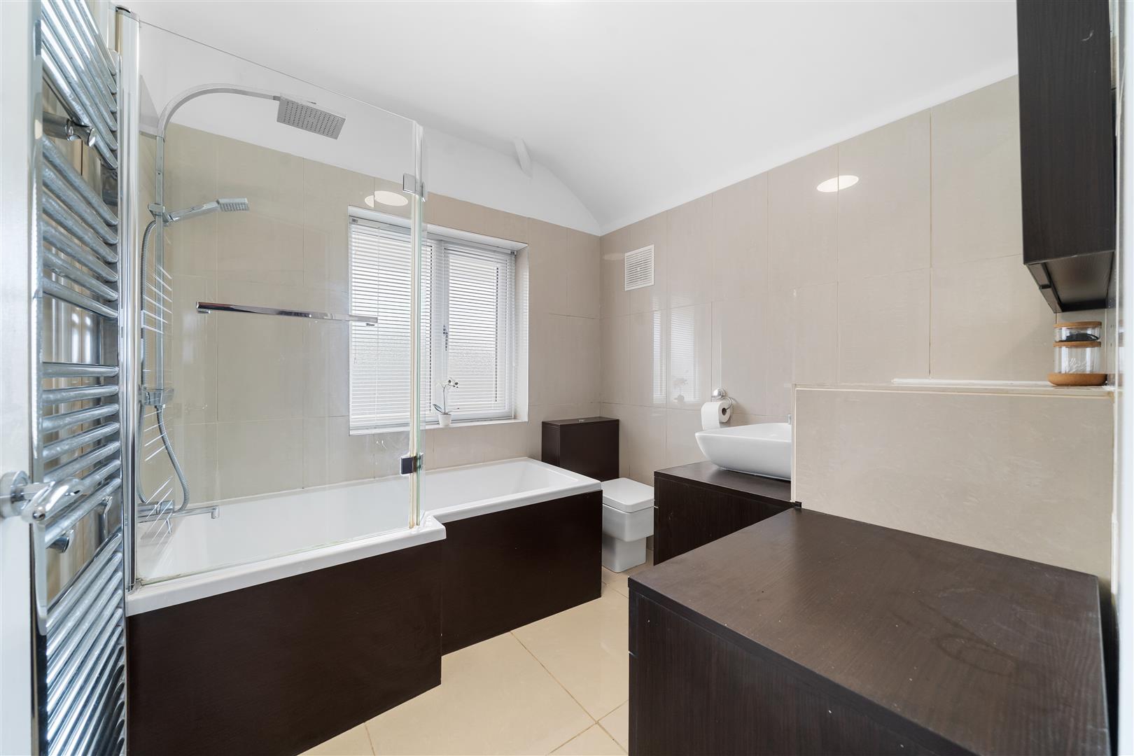 modern bathroom with white suite comprising; panelled bath with shower over, low level w.c. and wash hand basin in matching vanity cabinets, chrome heated towel rail, tiled floor and part tiled walls, uPVC double glazed frosted window to front aspect
